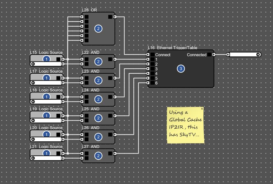 This module makes use of a Global Cache IP2IR (IP2IR-P Specs | Global Caché (globalcache.com)) to send IR signals captured from a SkyTV remote to do Channel Up and Down through a BSS BLU. The module can be modified easily to add additional remote commands. This module makes use of all 3x IR Transmitters for a total of 3x Decoders.