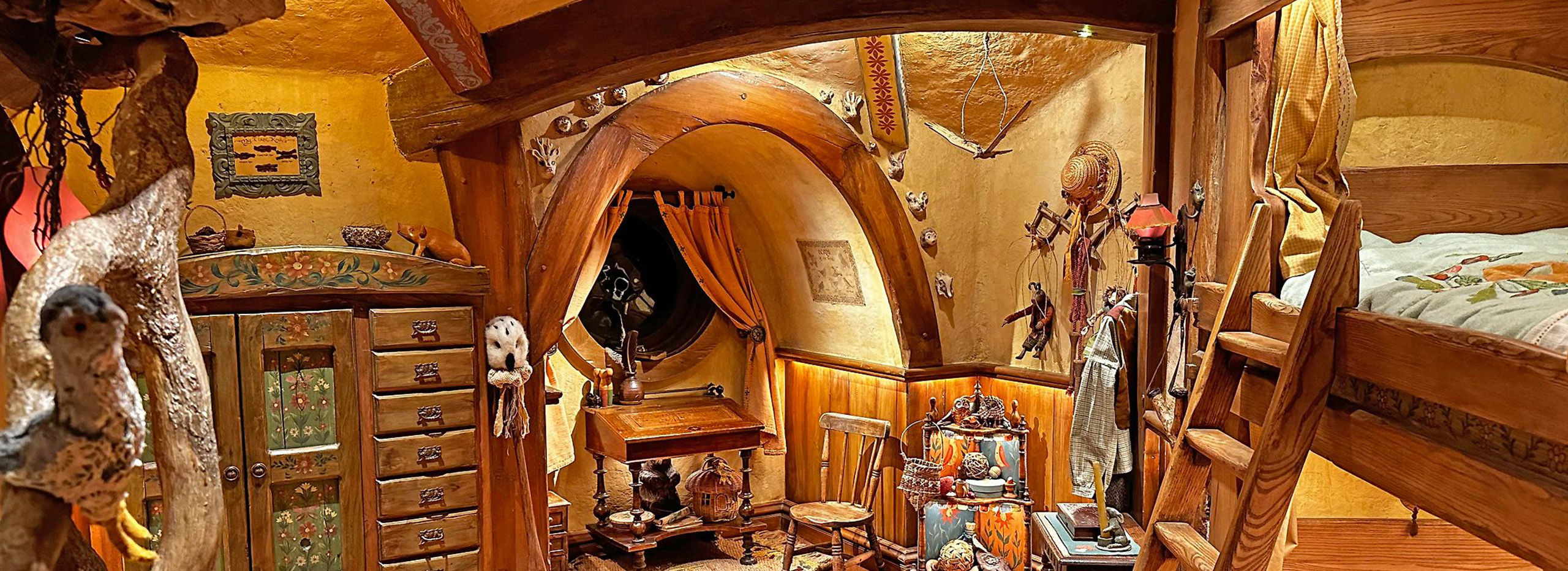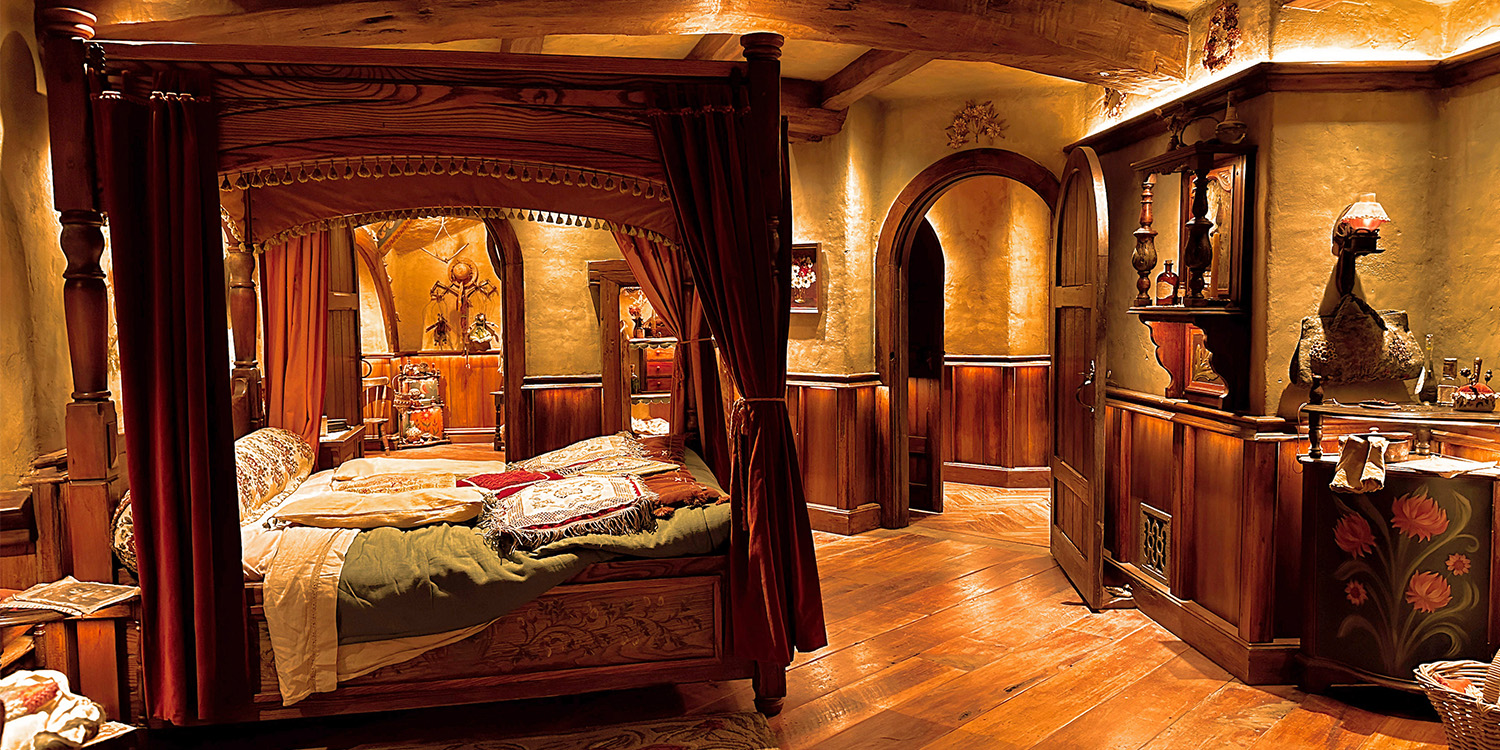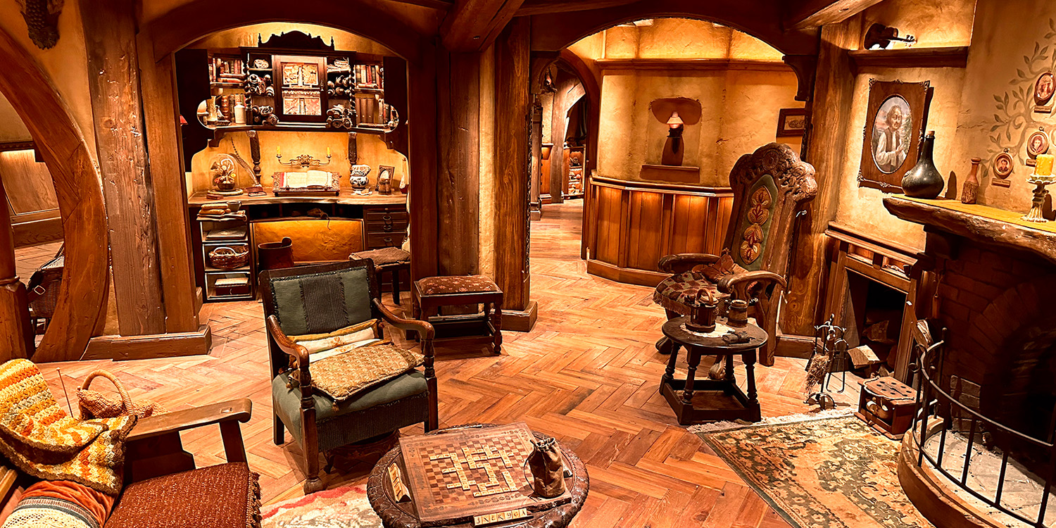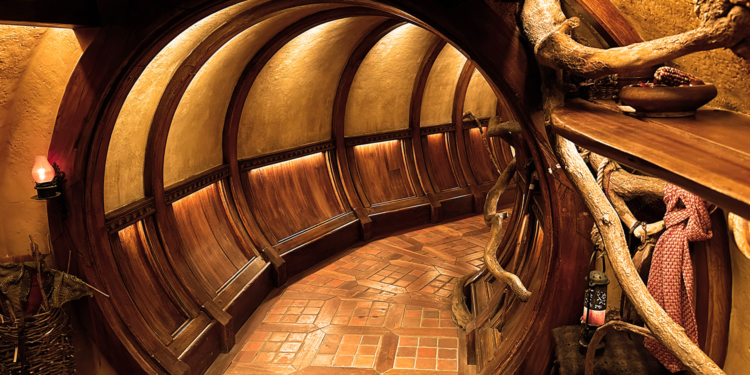 Today, when visitors enter the homes, they see the same snug, earth-sheltered, natural abodes with the curving architecture, soft oil lamps, and hand-crafted furniture that Director Peter Jackson envisioned for the films. Guests wander first through bedrooms, a parlor, and a bathroom, and then continue their tour in the second half of the home, taking in a kitchen, dining room, study, and pantries stocked to reflect the trades of the two families, the Twofoots and the Proudfoots, one in wicker baskets and the other in wine and cheese.