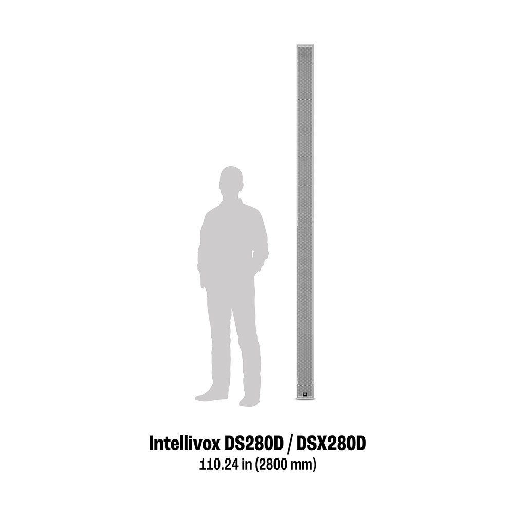 The Intellivox DSX280D is an active column loudspeaker array designed for sound reinforcement and public address in large or reverberant spaces such as transport hubs, houses of worship, parliaments, lecture halls, theatres, atriums, and museums. It features JBL’s Digital Directivity Synthesis (DDS) Beam Shaping DSP technology, which allows installers to precisely define listener coverage areas with minimal reflections and maximum direct‑to‑reverberant ratio for clear, intelligible sound – even in the most challenging acoustic spaces.