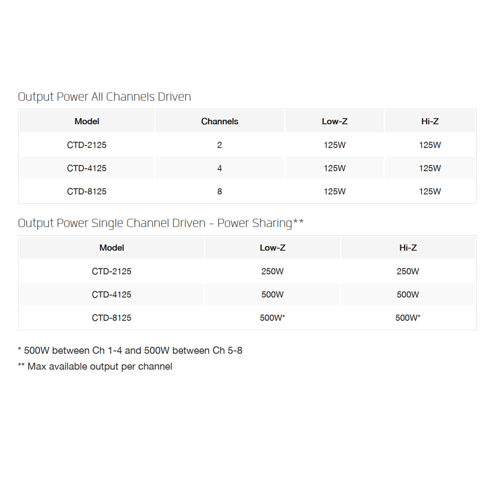 The CTD-8125 delivers 125 watts per channel of legendary Crown amplification when all channels are driven equally. Asymmetrical power sharing enables each set of four channels to share 500W in any ratio, offering unparalleled flexibility. (500W power sharing between Ch 1-4 and 500W between Ch 5-8).