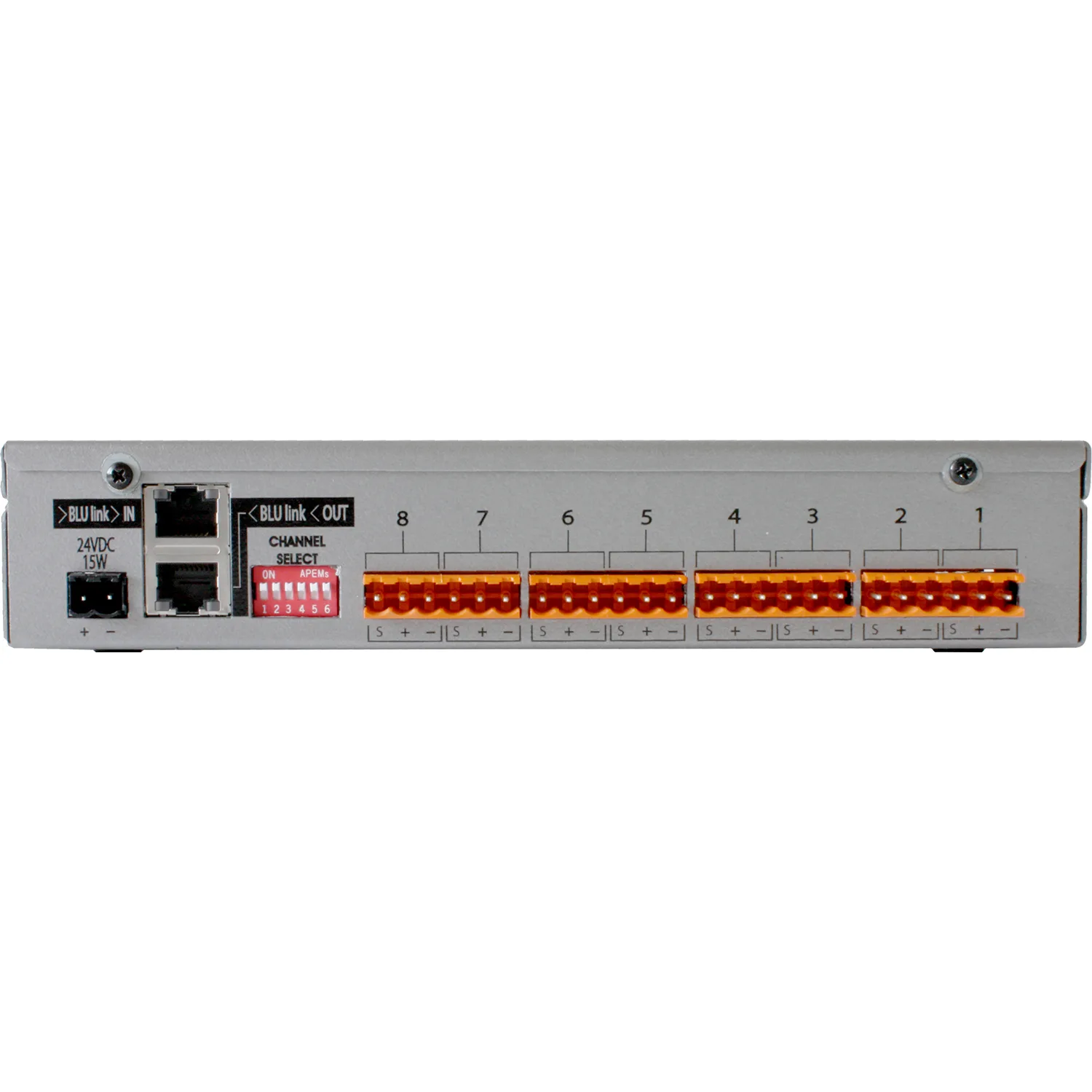 The 8 analog line level outputs utilize the same terminal block connectors as the other members of the Soundweb London family.