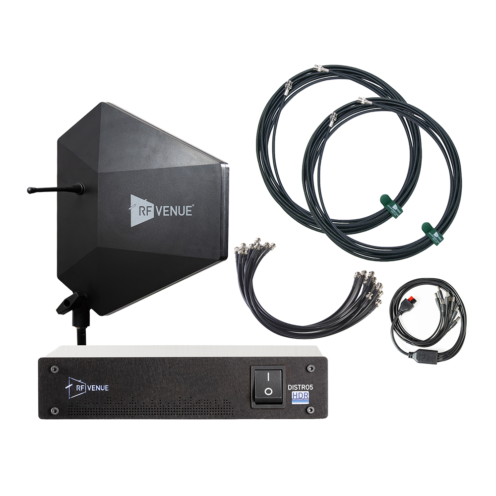 The 5 Channel Wireless Microphone Upgrade Pack with Diversity Fin? IPX Antenna is the ultimate turnkey RF solution for professionals who need rock-solid wireless performance in the most demanding environments. This comprehensive bundle combines the rugged, IP-rated weather-resistant Diversity Fin IPX Antenna with the high-performance DISTRO5 Antenna Distribution System, premium RG8X cabling, and the specialized OCTO Cable for streamlined power management.
