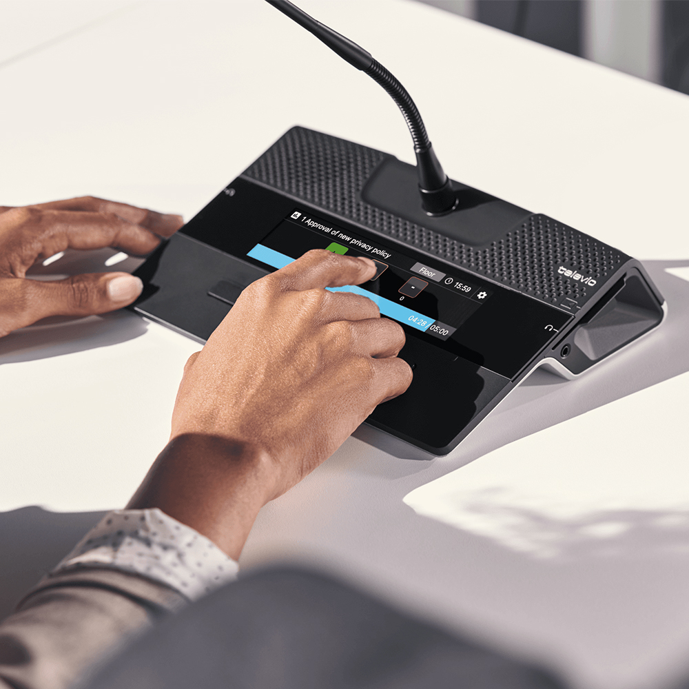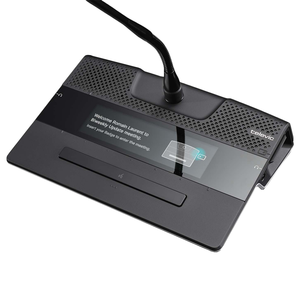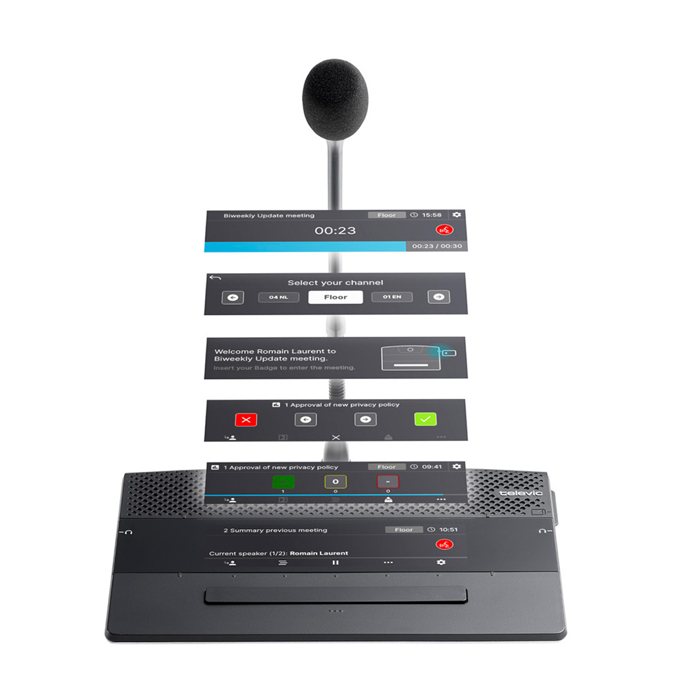 The integrated touchscreen displays relevant meeting information, including agenda items, speaker identification, position in the speaking queue, voting and polling results, and other contextual data. The interface can be personalised with customer branding by adding a logo.